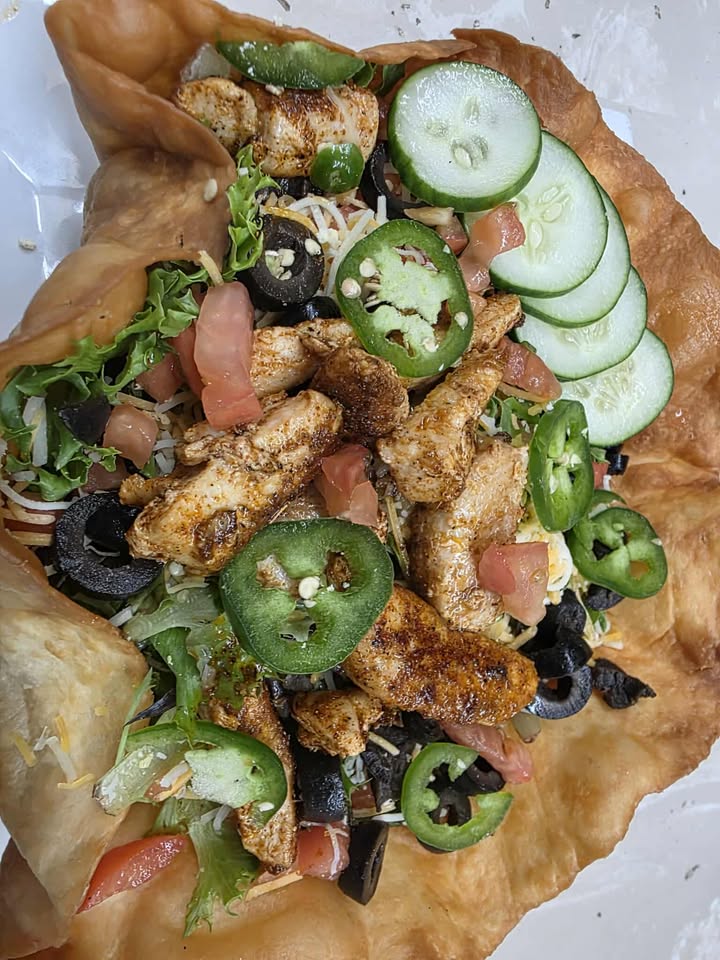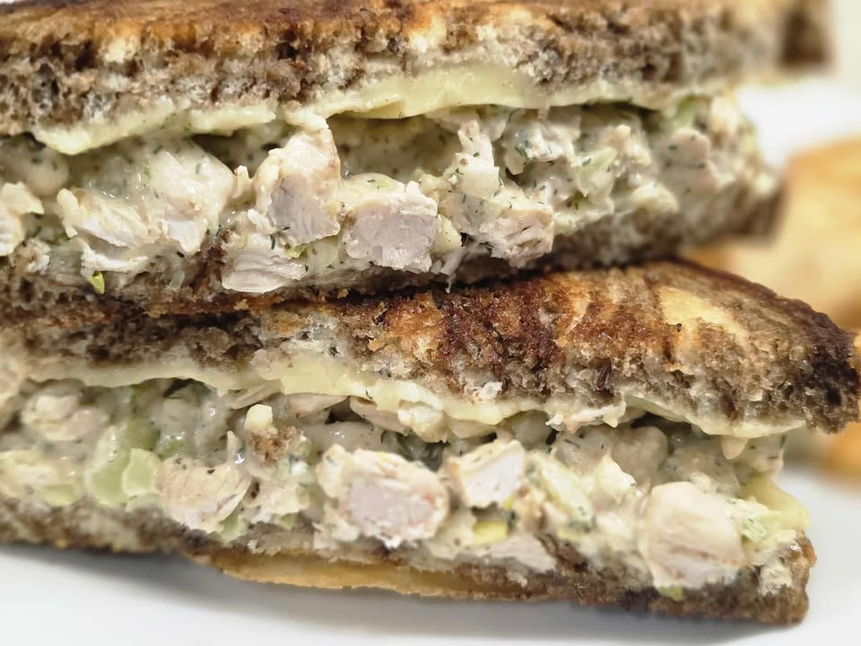 Sauteed chicken, creamy lemon dill dressing, celery, on grilled sourdough rye bread with sliced American cheese. Served with house chips. 11