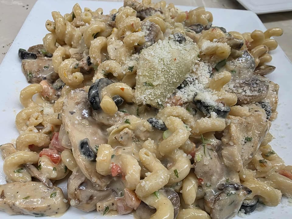 Mushrooms, tomatoes, sherry parmesan cream sauce, chicken, artichoke hearts, and black olives, with cavatappi pasta. 19