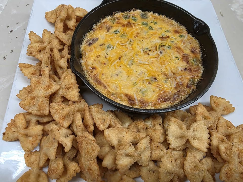 Cream cheese, applewood bacon, monetary jack, cheddar, caramelized onions, roasted jalapenos, and bowtie pasta chips. 10