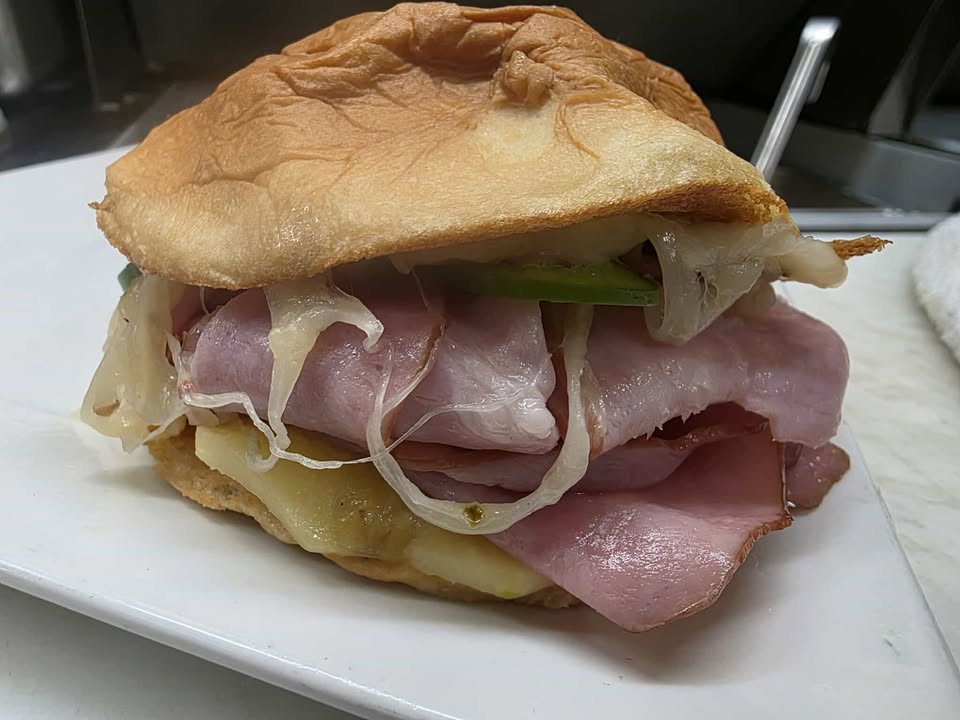 Grilled King's Hawaiian bread, sliced ham, sliced jalapeno, pepperjack cheese, and sliced pineapple. Served with a side of house chips. 10