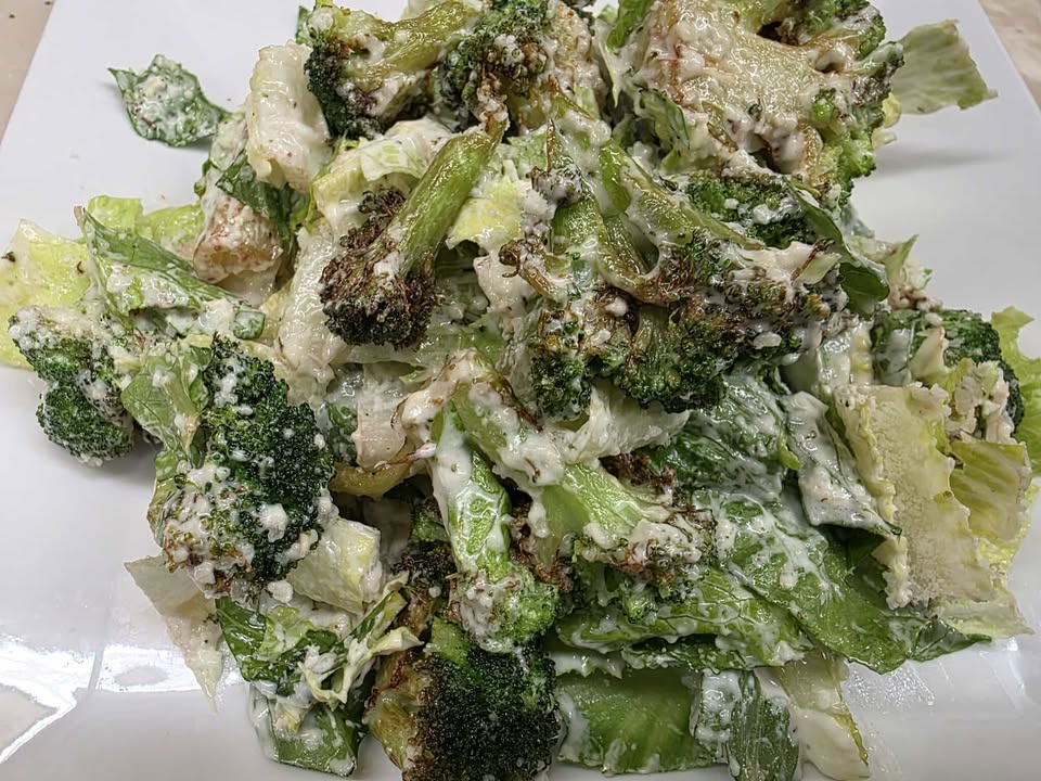 Romain, roasted broccoli, Caesar dressing, red onion, croutons, and parmesan. 12