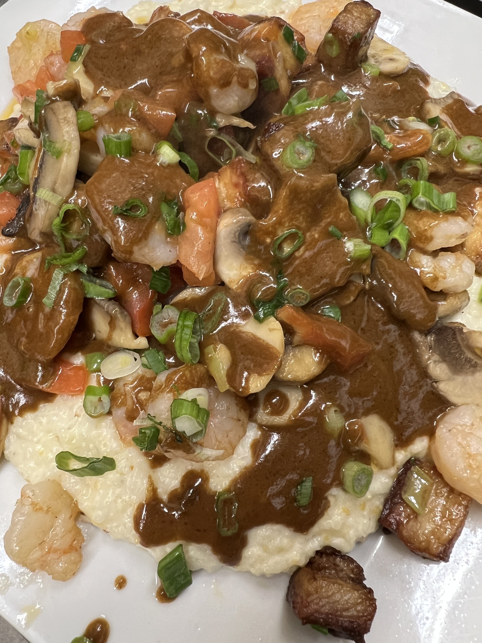 Shrimp, crispy pork belly, mushrooms, tomatoes and green onions over creamy grits with brown butter barbecue sauce. 19
