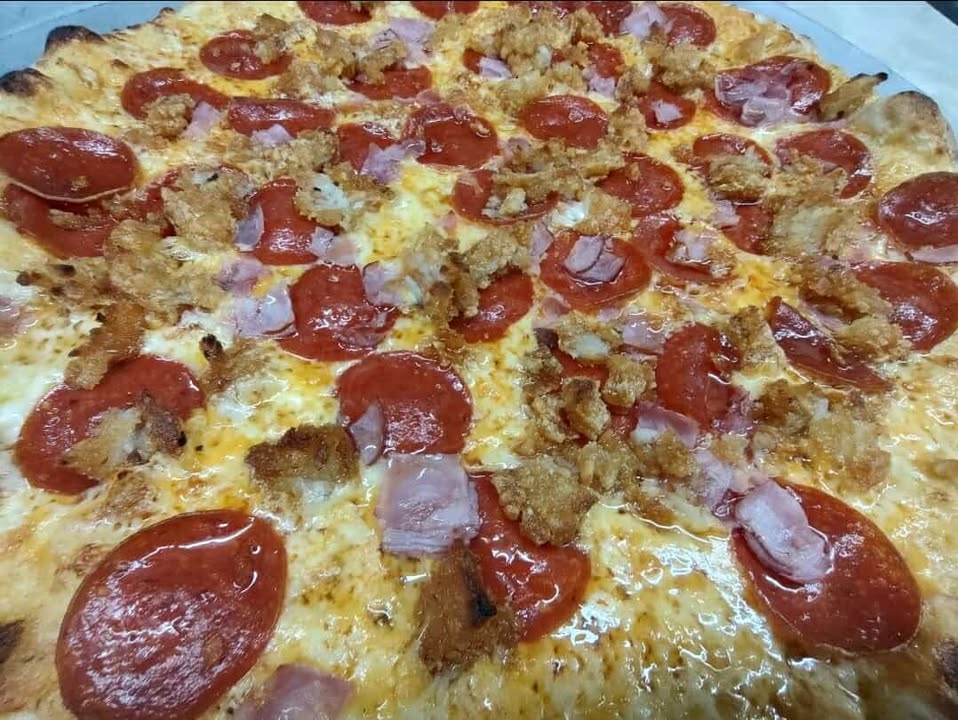 Creamy spiced ricotta sauce, hickory-smoked gouda, cheddar, and raclette cheese, topped with pepperoni, ham, and crispy hash brown nuggets. 12”- $16 14”-$18 16”- $20 18”-$22