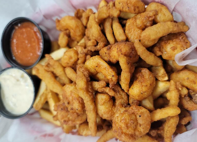 Crispy fried clam strips over fries with cocktail and tartar sauce. 15
