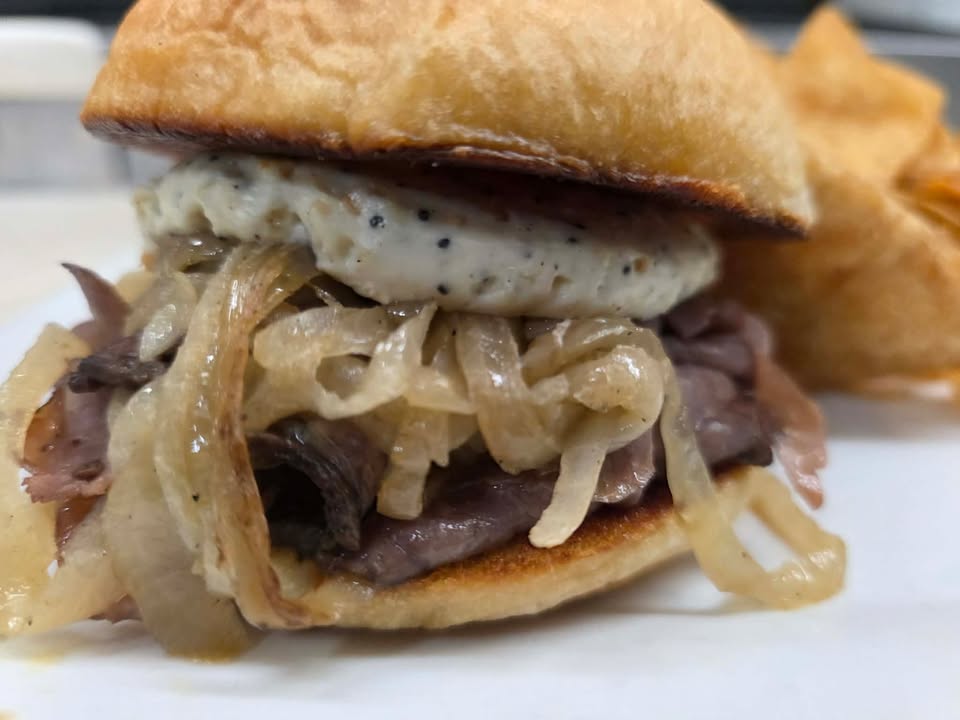 Crispy fried chicken on a toasted brioche roll, slathered with bang-bang sauce and topped with kosher dill pickles. Served with house chips. 13