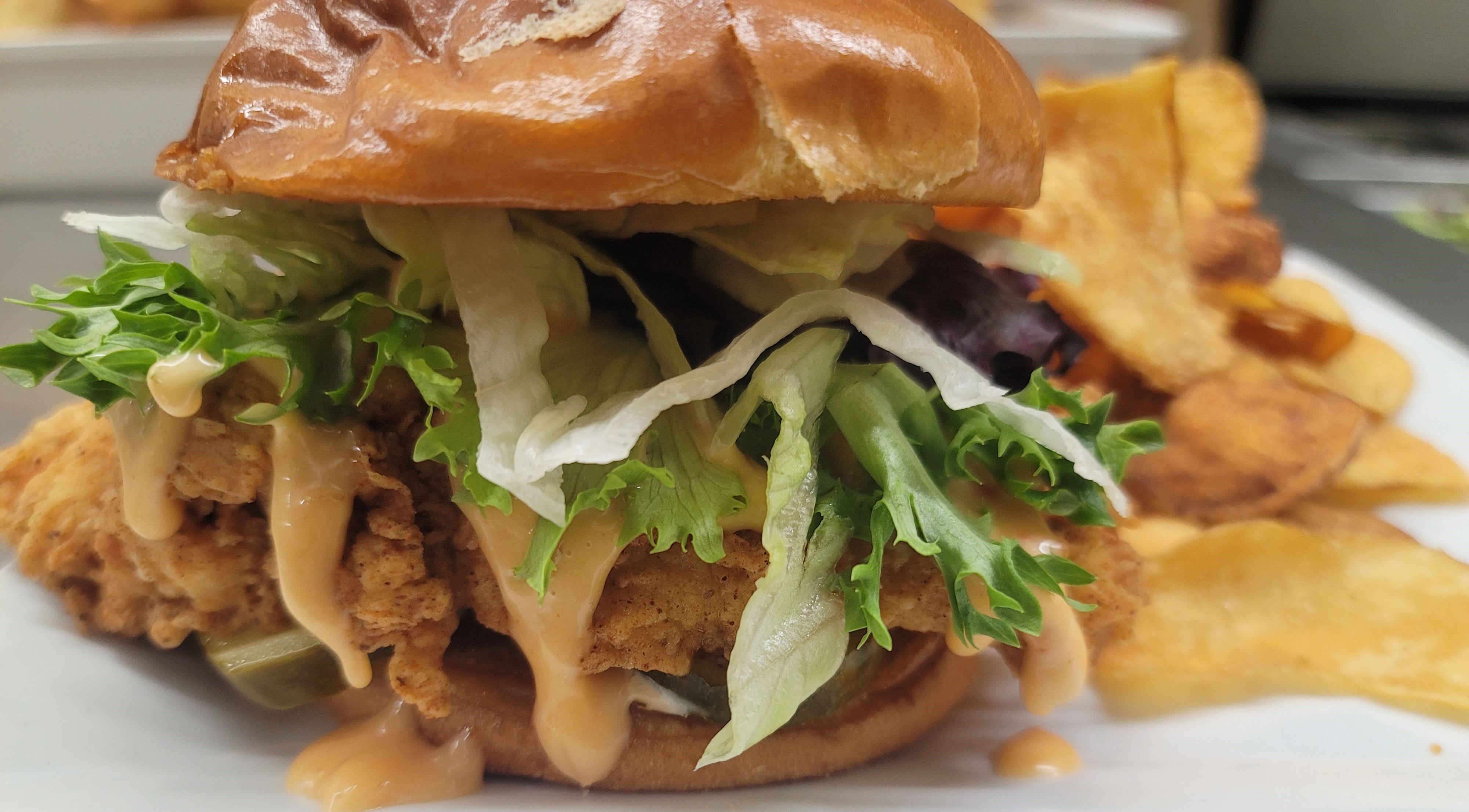 Crispy fried chicken on a toasted brioche roll, slathered with bang-bang sauce and topped with kosher dill pickles. Served with house chips. 13